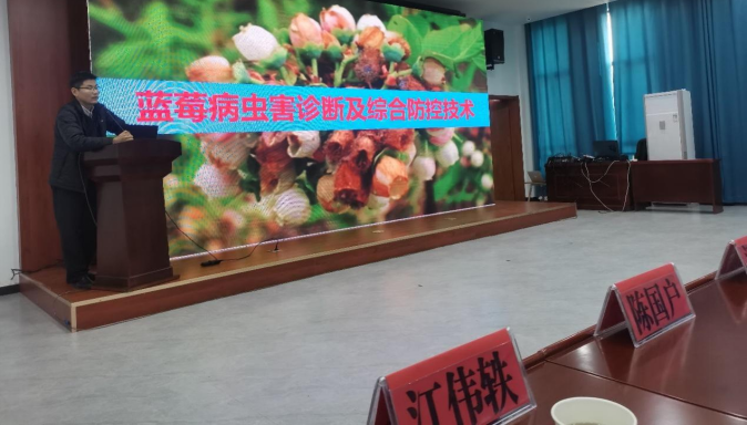 蓝莓科技特派员,通过线下+线上,开展灵活多样的技术指导、咨询和培训服务。组织乡镇领导、村集体经济负责人与种植大户到蓝莓种植水平较高的县观摩学习。2023年11月29日,团员高学玲教授、叶振风高级实验师、王乃富副教授分别做了怀宁蓝莓深加工技术、蓝莓病虫害防治技术等学术报告,全县40多家蓝莓参加了学术交流会。近2年来,科技特派团开展技术培训20多场次,培训各类骨干技术人员、种植大户1600多人次,怀宁蓝莓种植生产技能得到明显提升。