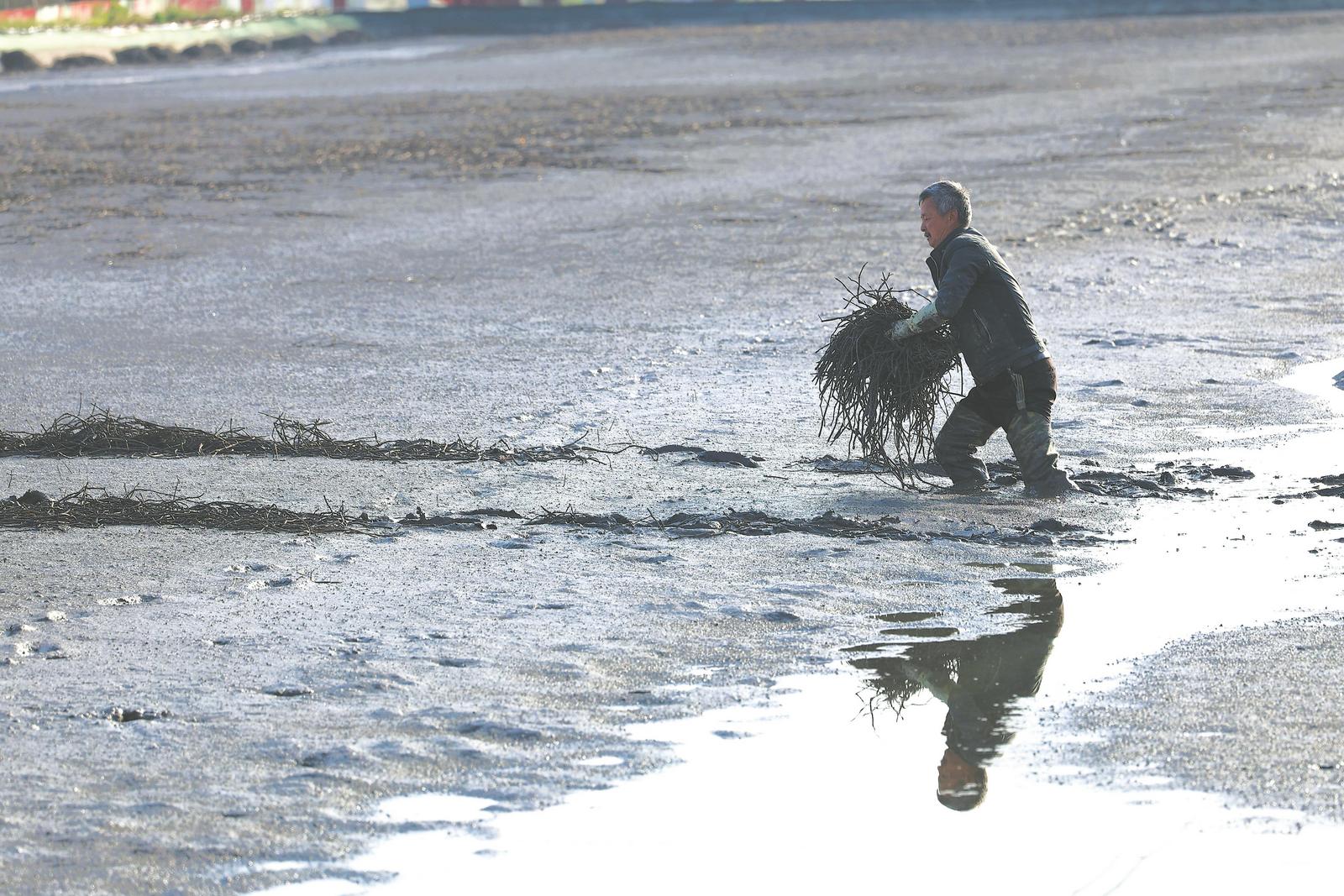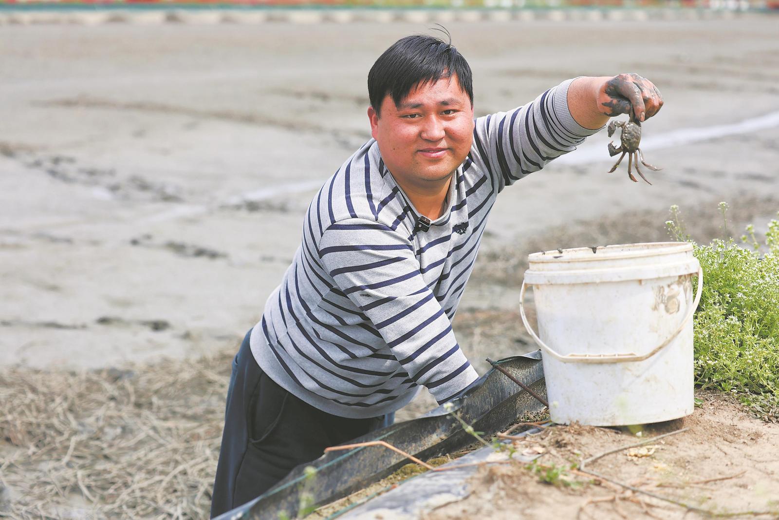 3月21日,许友为在蟹苗塘挑选优质蟹苗。