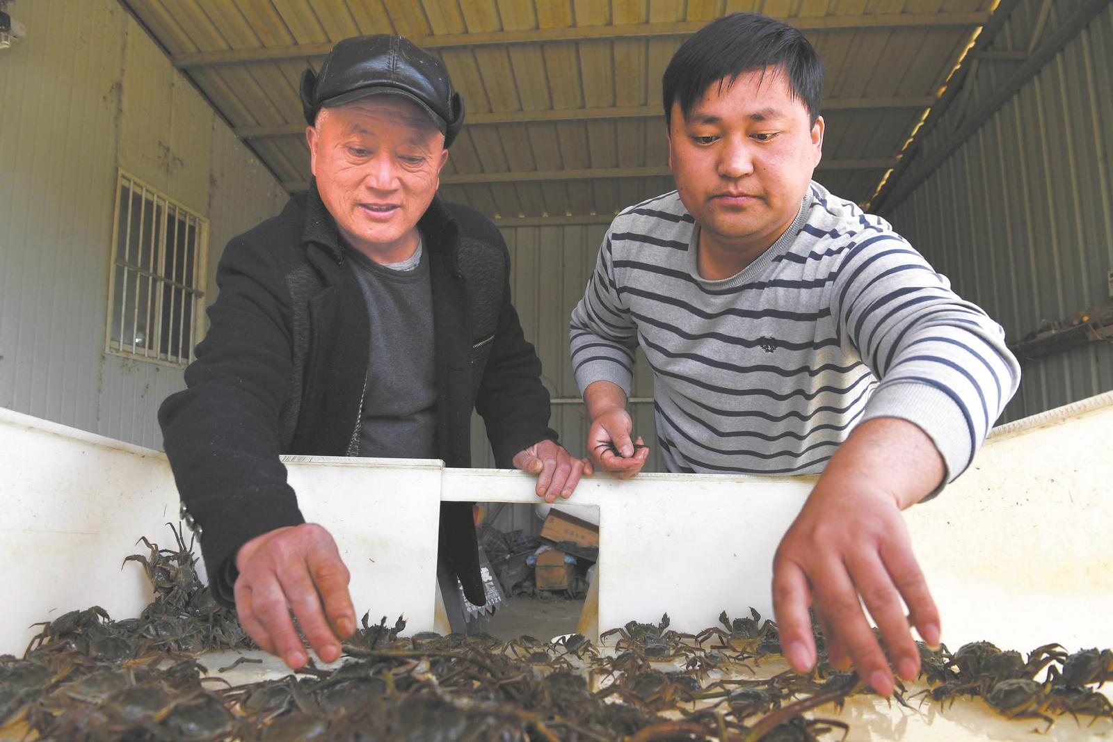 3月21日早晨, 在无为市泉塘镇金牛村,许友为像往常一样来到蟹苗塘优选蟹苗,投放到更大的养殖蟹塘,同时做好塘口维护防逃、防渗等工作,为螃蟹丰收做准备。